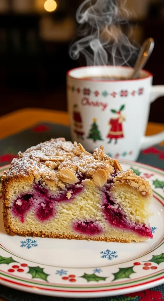 A slice of coffee cake with cranberry swirls and almond crumble on a Christmas plate beside a steaming mug.