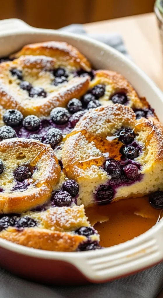 1. Layer bread and blueberries in a greased dish.