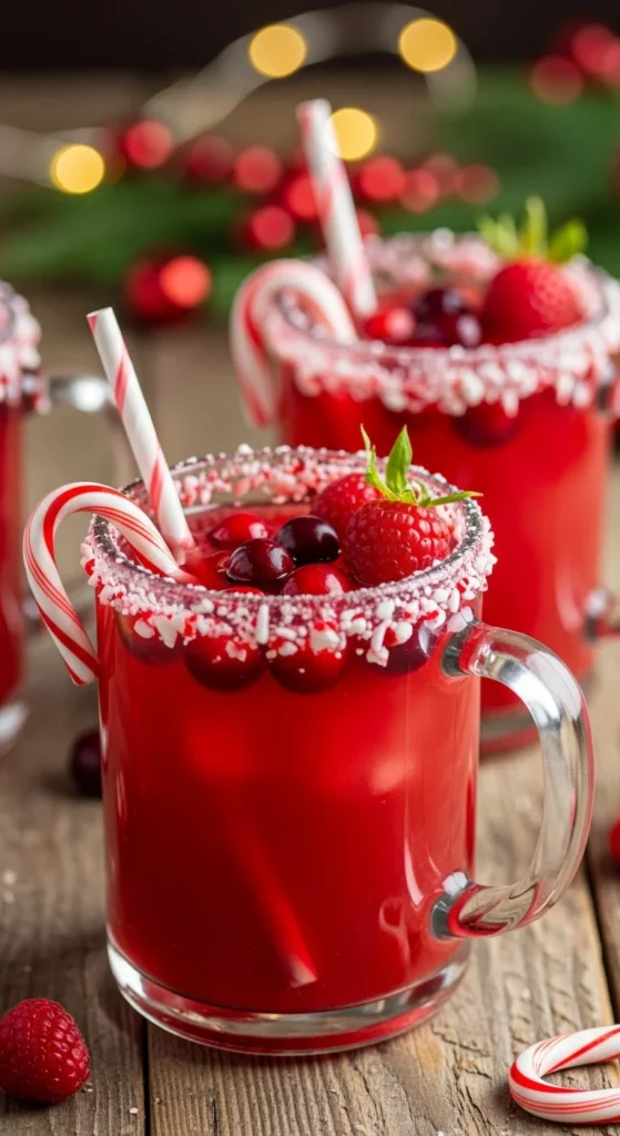 Rim glasses with crushed candy canes and top with a few fresh raspberries.