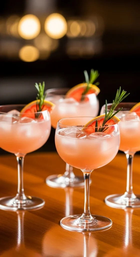 Garnish each glass with a rosemary sprig and a grapefruit slice.