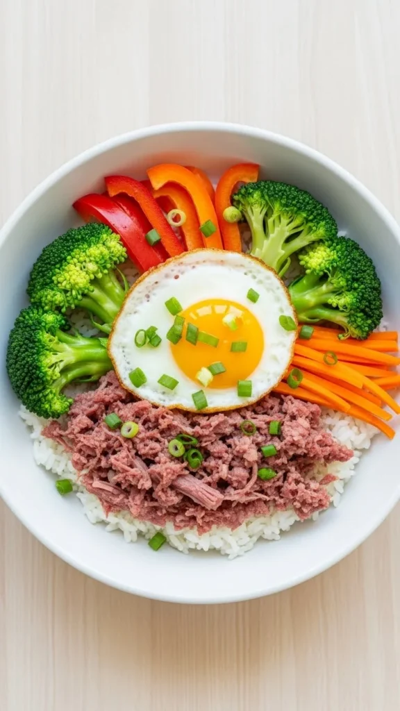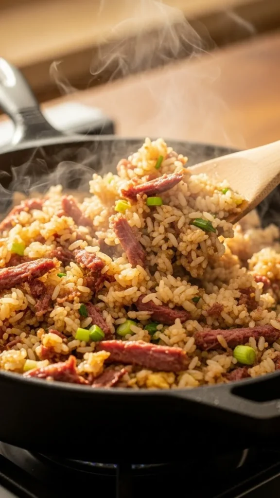 3. Add rice and corned beef, stir-fry 5 minutes.
