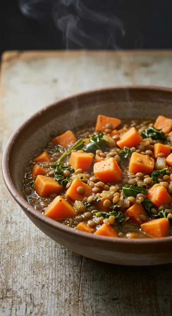 - Add lentils, sweet potato, broth, and cumin. Simmer 25 minutes.