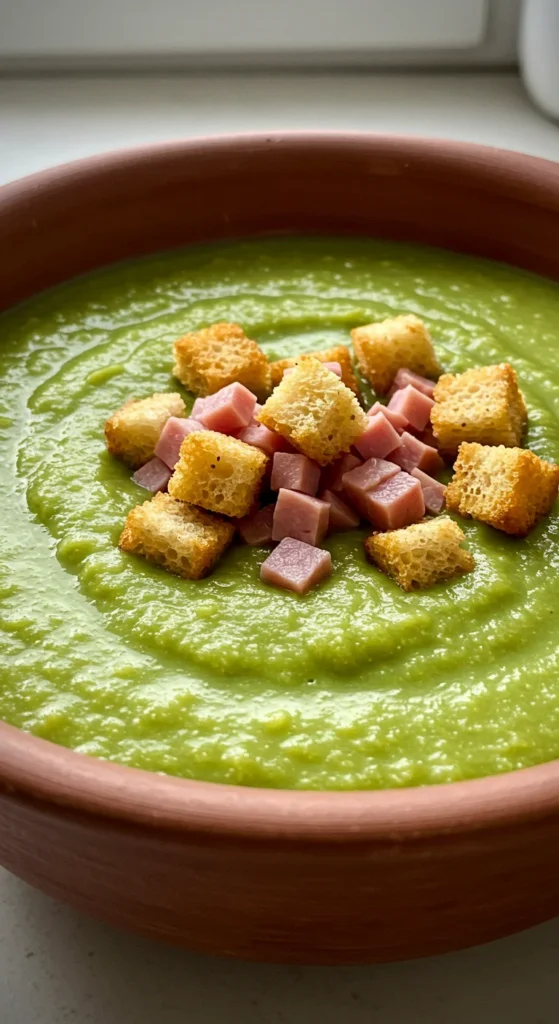 - Add peas, broth, ham, and bay leaf. Simmer 45 minutes.