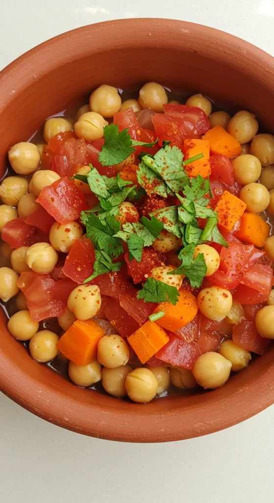 - Add chickpeas, tomatoes, broth, and spices. Simmer 20 minutes.