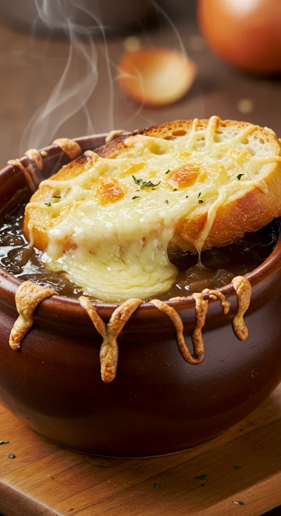 - Ladle into bowls, top with baguette and cheese, broil until bubbly.