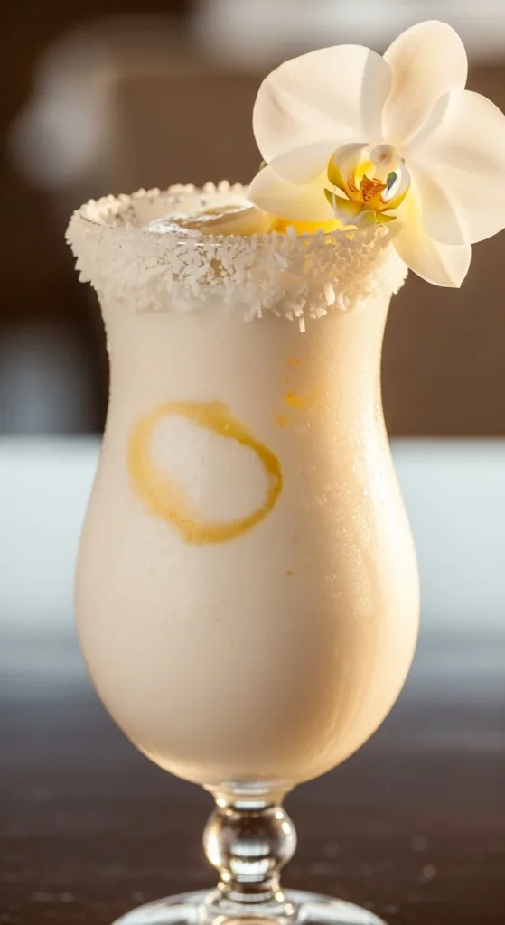- Shake and serve in coconut-rimmed glass.