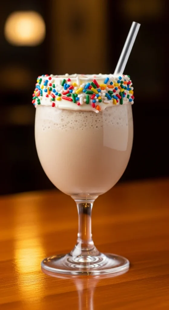 - Shake with ice; pour into sprinkle-rimmed glass.