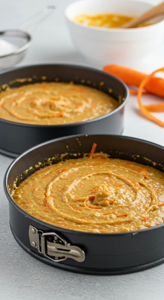 Once mixed, divide evenly into two 8-inch round cake pans (or a 9×13-inch pan if you prefer a single-layer cake). Line the bottoms with parchment paper for easy release.