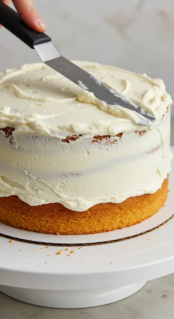 For layer cakes, frost the top of one layer, stack the second on top, and coat the whole thing in a smooth, creamy finish.
