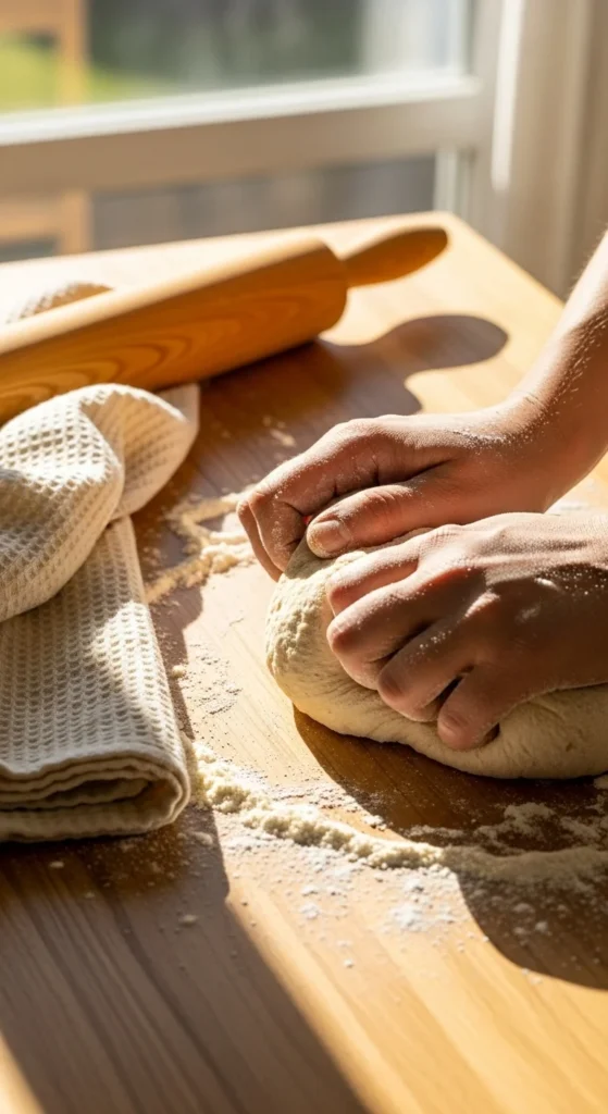 - Knead the dough on a lightly floured surface for about 8–10 minutes, until smooth and elastic.