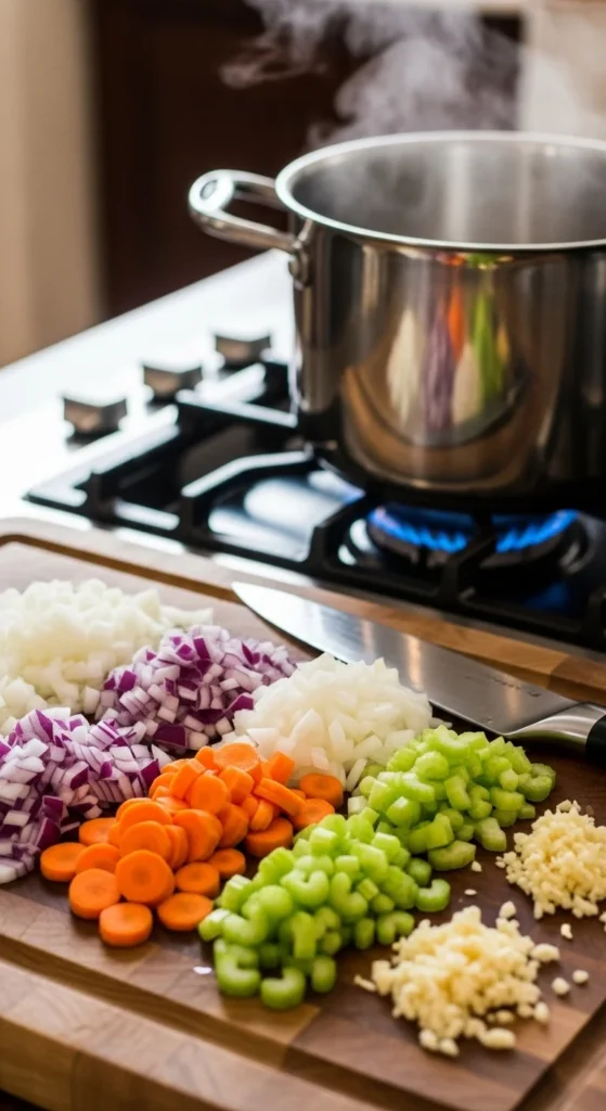 [Image Prompt] Chopped onions, carrots, celery, and garlic arranged on a cutting board beside a pot on the stove.