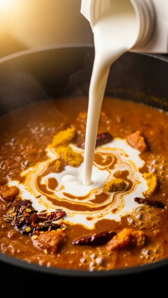 Coconut milk creates a mild, creamy curry, while tomatoes give a tangy, hearty base.