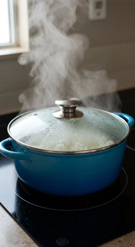 - Cover with a tight-fitting lid—this traps the steam that cooks the rice evenly.