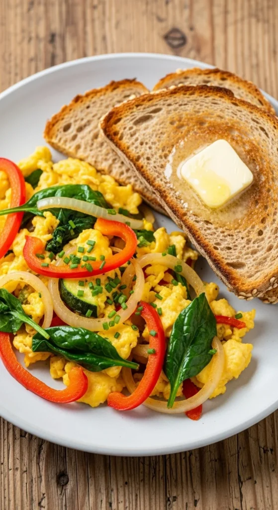 • Eggs + roasted vegetables + whole-grain toast