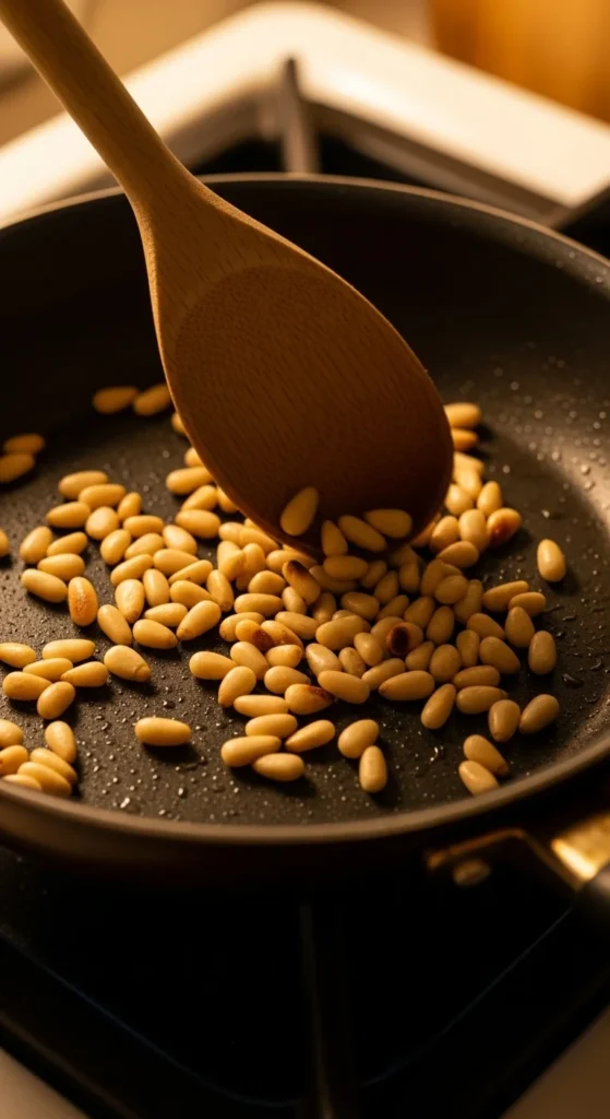 This step takes your pesto from good to amazing. Lightly toast the pine nuts in a dry skillet over medium heat for 3–4 minutes. Stir often until they’re golden and fragrant — but not burned! Toasting enhances the nutty flavor and makes your pesto richer.