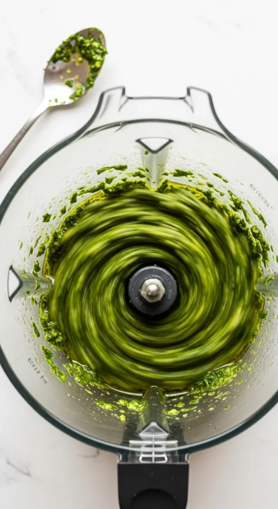 Now, with the food processor running, slowly drizzle in olive oil until the mixture becomes smooth and creamy. You can adjust the consistency by adding a bit more oil or cheese.