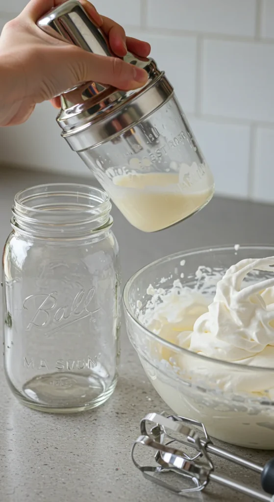 1. Pour the cream into the jar, filling it halfway so there’s room to shake.