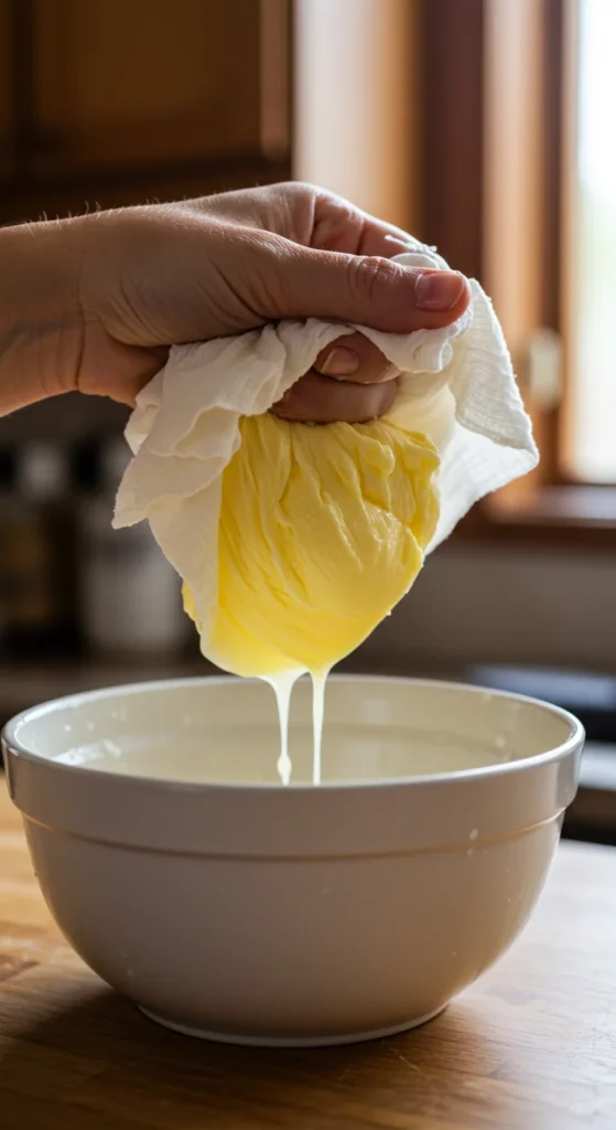 • The liquid that drains out is your homemade buttermilk — store it in a jar for baking later.