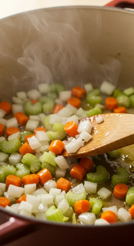 Sauté over medium heat for about 5–7 minutes until fragrant and golden. This simple step makes a big difference in how rich your soup tastes.
