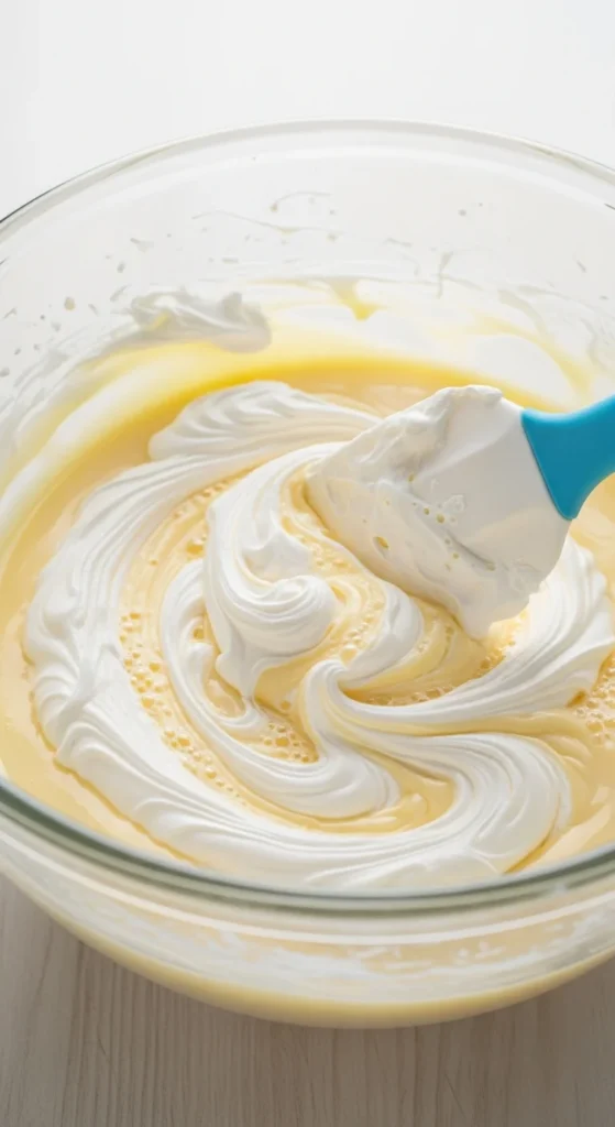 Then, gently fold the whipped cream into the milk mixture, a little at a time. Don’t stir too hard — you want to keep all that lovely air in the mixture!