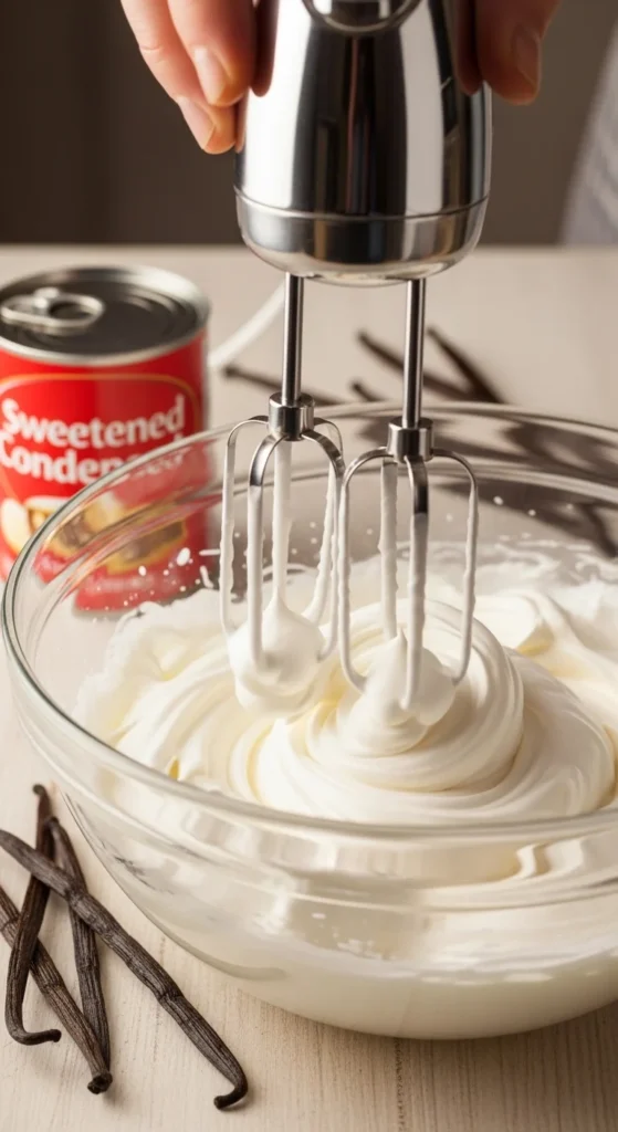 Pour the heavy cream into a chilled mixing bowl and whip until stiff peaks form. You want it light, airy, and holding shape — kind of like whipped frosting.