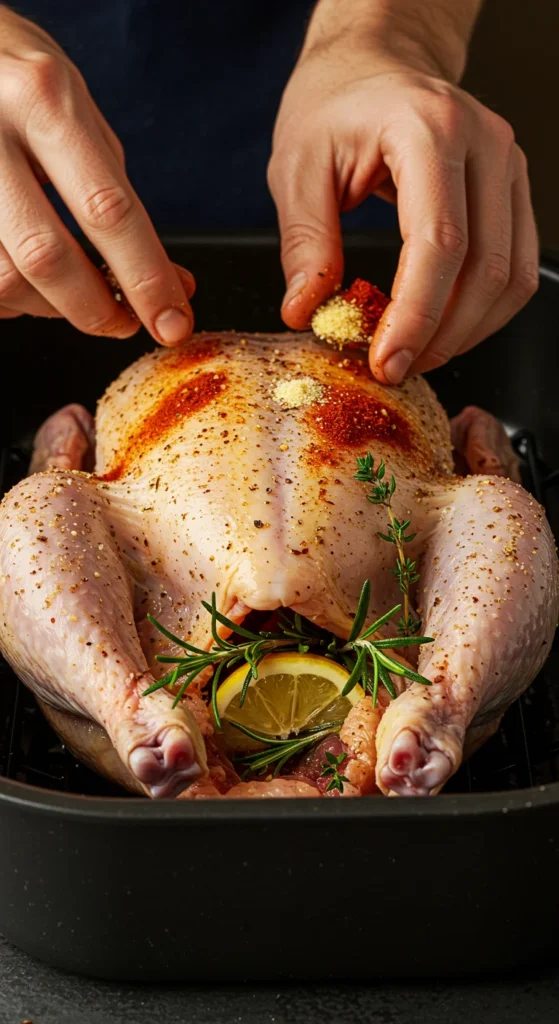 Before roasting, let your chicken rest at room temperature for 30 minutes—this helps it cook evenly. Then, pat it dry with paper towels. Dry skin = crispy skin.