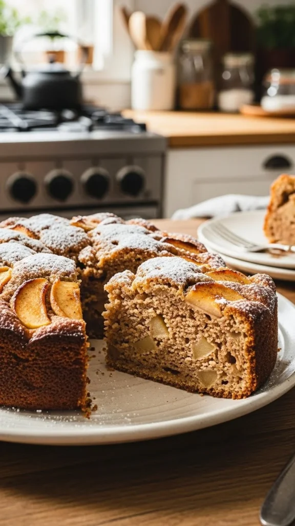 A tender cake filled with soft apples and gentle spice.