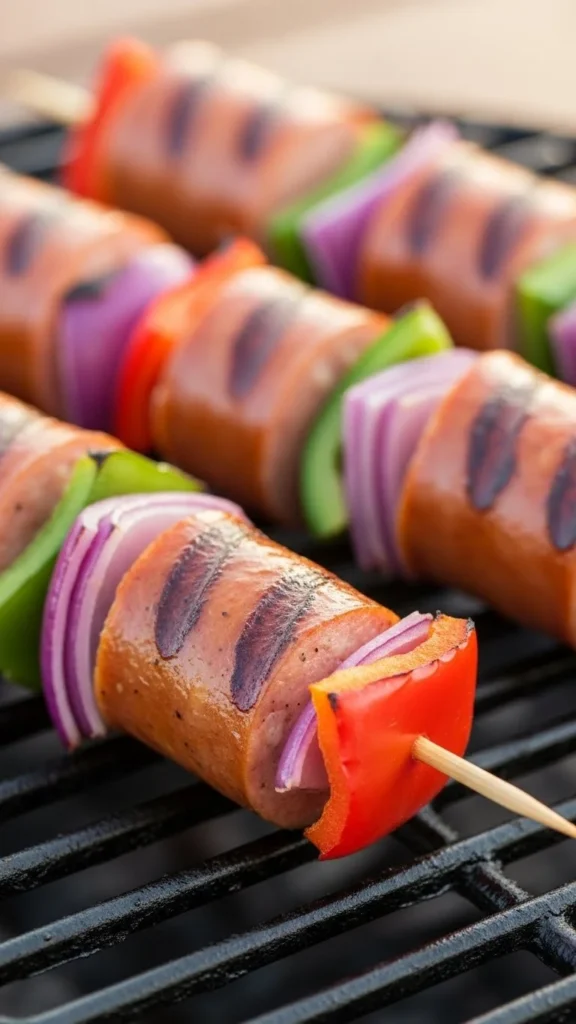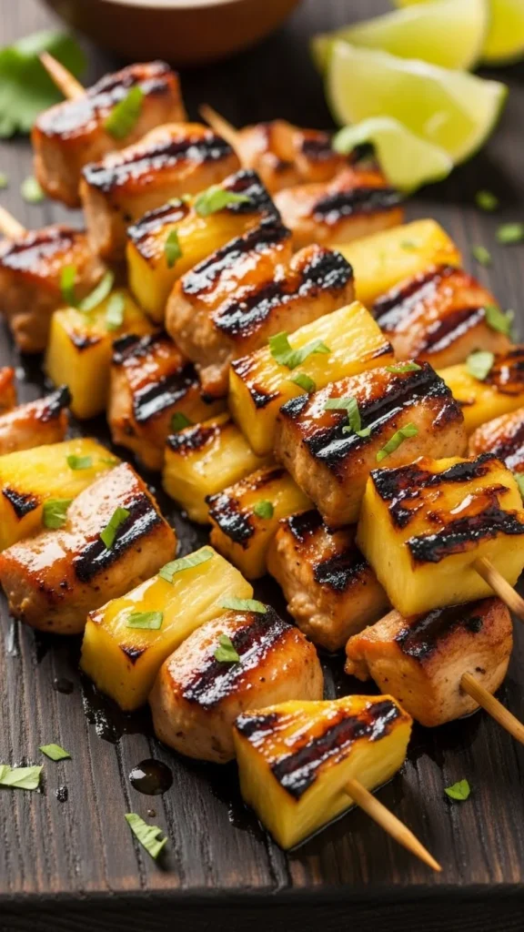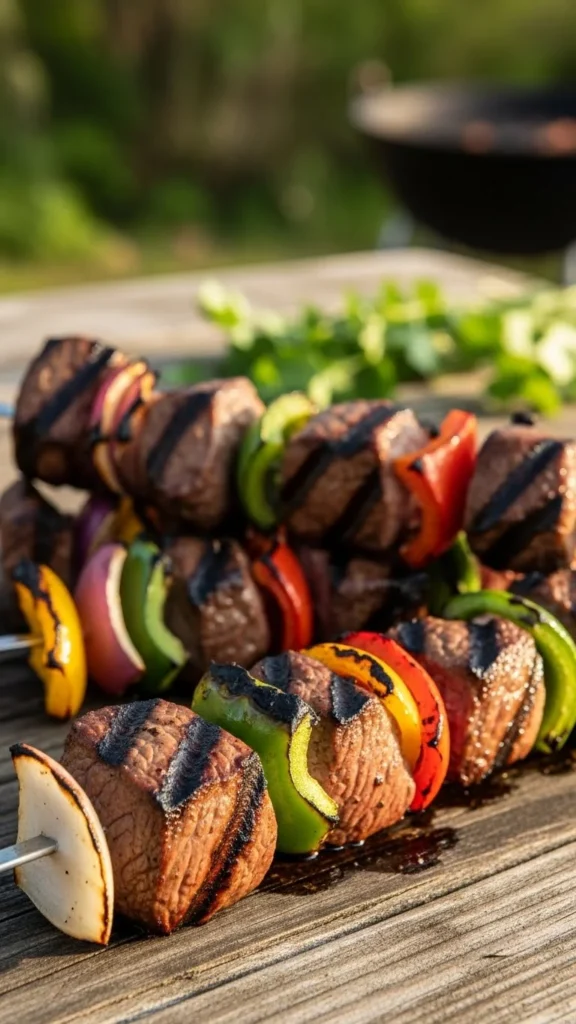 - Grill skewers 12–14 minutes, brushing with sauce.