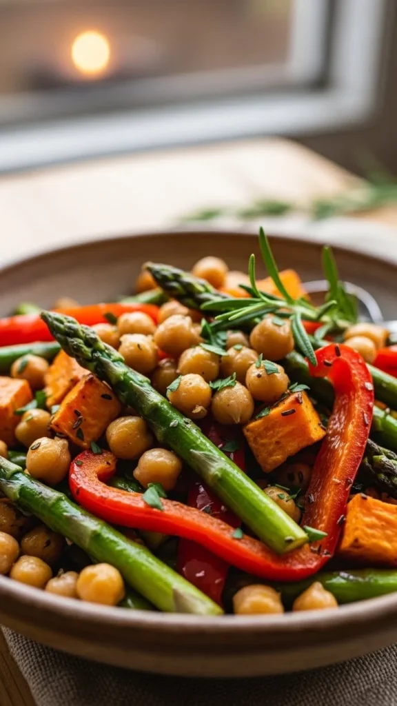 - Roast chickpeas and vegetables at 200°C (400°F) for 20 minutes.