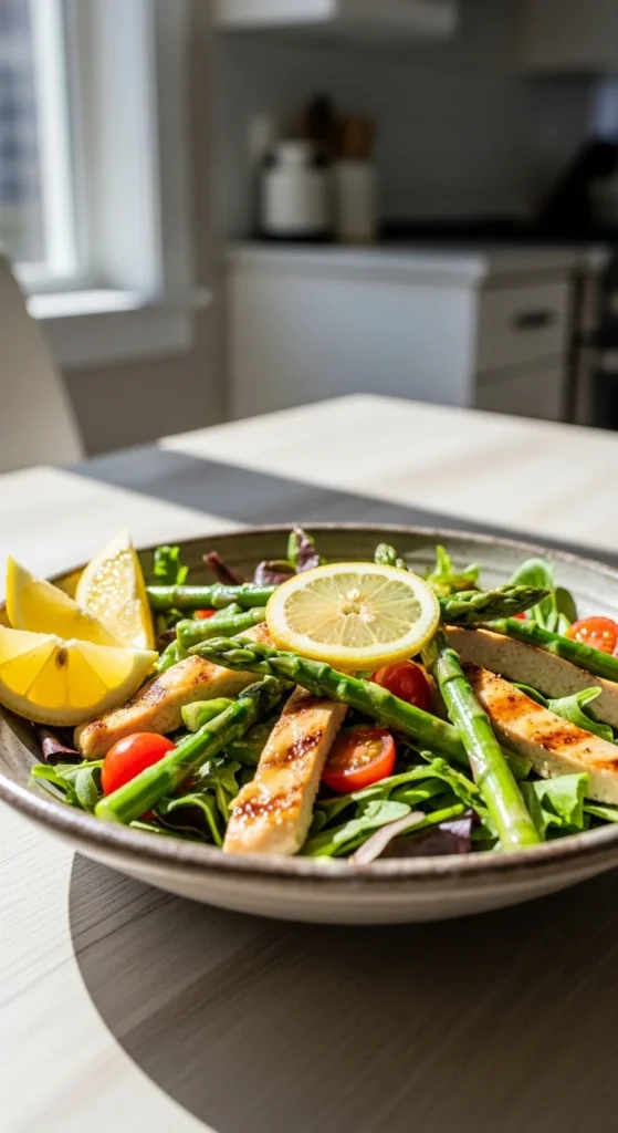 - Roast chicken and asparagus at 400°F / 205°C for 20–25 minutes.
