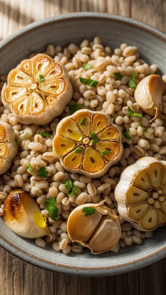 Mash garlic into warm barley before serving.