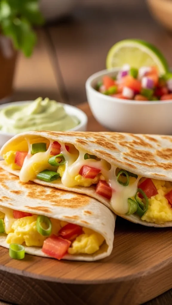 Scramble eggs, fill tortillas, and warm 5 minutes in a skillet.