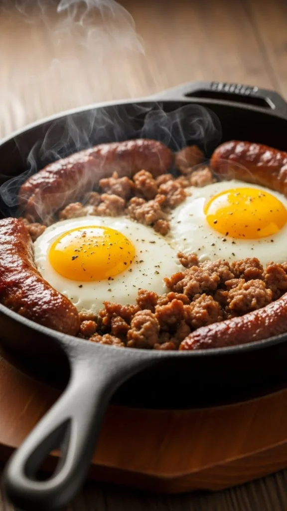 Cook sausage until browned, crack eggs on top, cover, and cook 5–7 minutes.